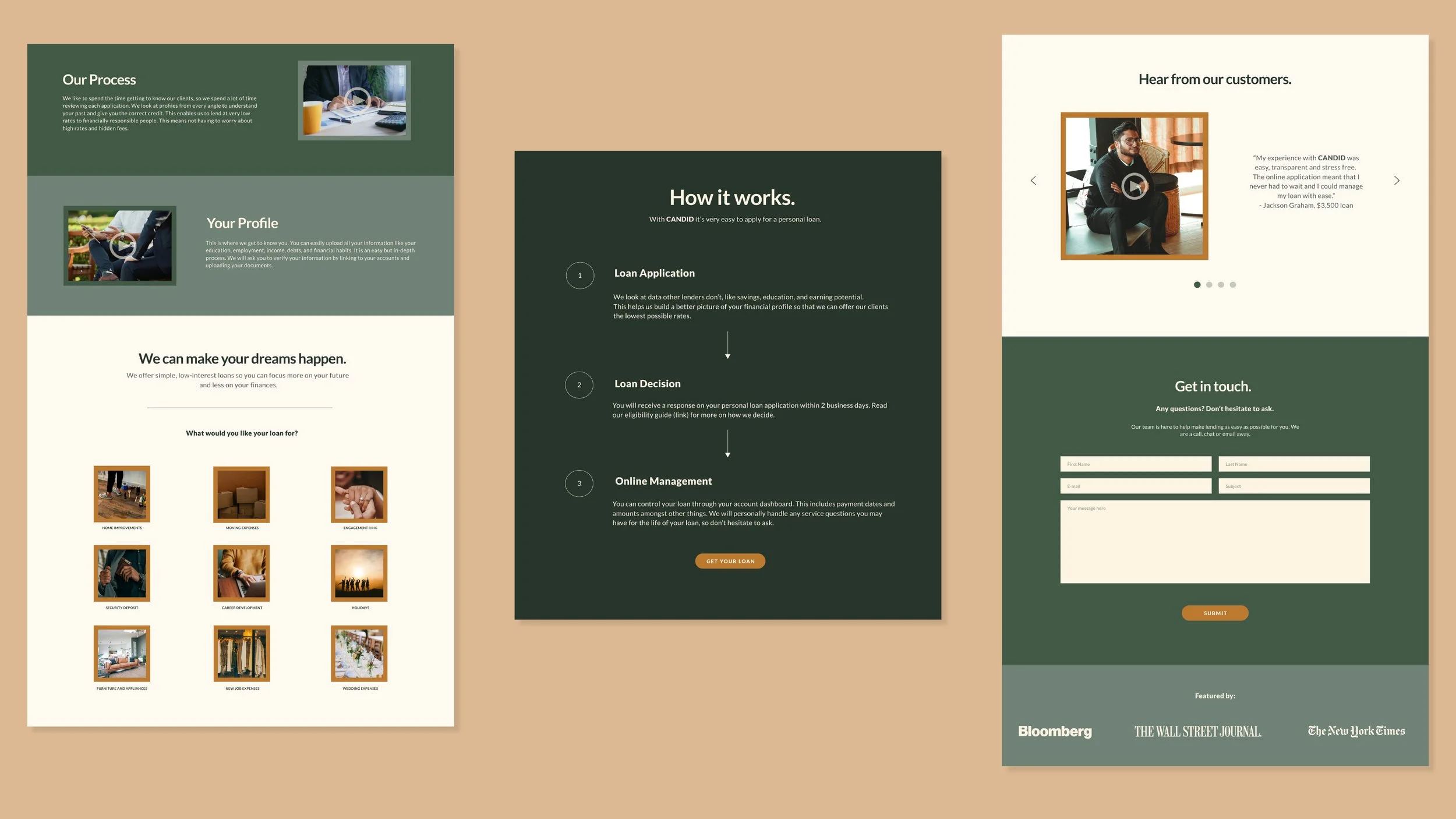 SOLUTION: The visual keywords chosen were straightforward, friendly, and reliable. The palette was selected to be inviting, communicate warmth, and tie into colors commonly associated with money. Imagery was selected based on warmth and relatability. The layout was created to be clean and spacious, with visual hierarchy emphasizing clear and straightforward information relevant to the target audience. Videos were included to make the site more engaging, and a footer with high-profile endorsements was also included to emphasize the trustworthy and reliable nature of the company.